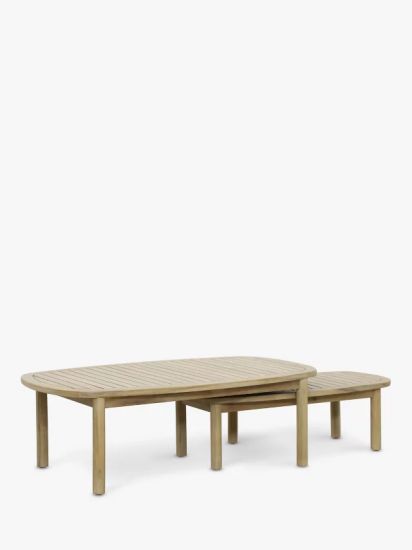 Our furniture is made from durable, naturally weather-resistant FSC certified Acacia wood. This pair of oval coffee tables nest together for compact storage, with the smaller table sliding neatly underneath the larger one.