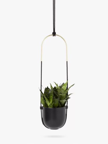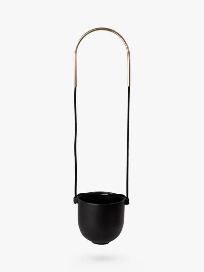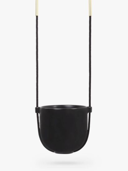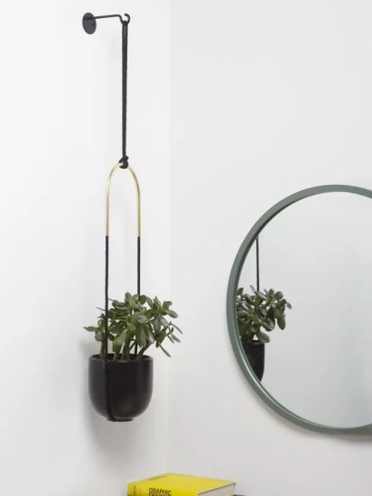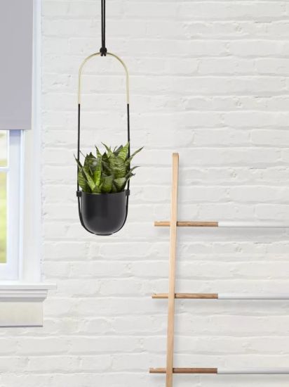 Hanging plants add a sense of height to a space. The ceramic planter is suspended by a matching rope design, and the curved metal with a brass finish creates a modern feel. Easy to mount on the wall or ceiling, it's perfect for ferns, succulents, and other greenery to bring the beauty of the outdoors indoors. Matching hooks and accessories included.