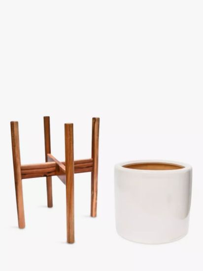 Indoor Ceramic Planter & Wood Stand, 24cm
