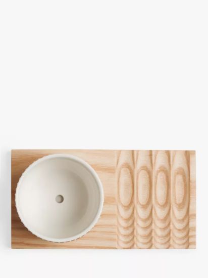 This planter is made of new bone china and sits on a beautifully textured wooden board.
